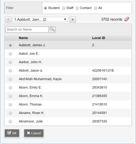 - In the Filter section, select Student, Staff, Contact, or All. The list of records updates accordingly.